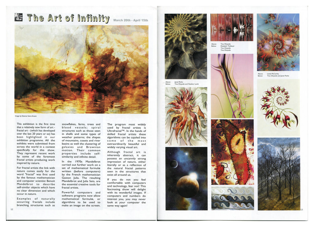 In September 2006 Simon Trapnell, the director of the Nature in Art Museum at Wallsworth Hall, Twigworth, Gloucestershire contacted Tina Oloyede to discuss a proposal to stage a fractal art exhibition for the spring of 2007. At a meeting a couple of months later, the format and logistics of setting up the exhibition were finalised. Janet Parke was invited to join Tina as a key exhibitor and to begin the selection process for the remaining exhibition pieces. Invitations were sent out to members of the international fractal art community to submit twelve images each to be considered for inclusion.
